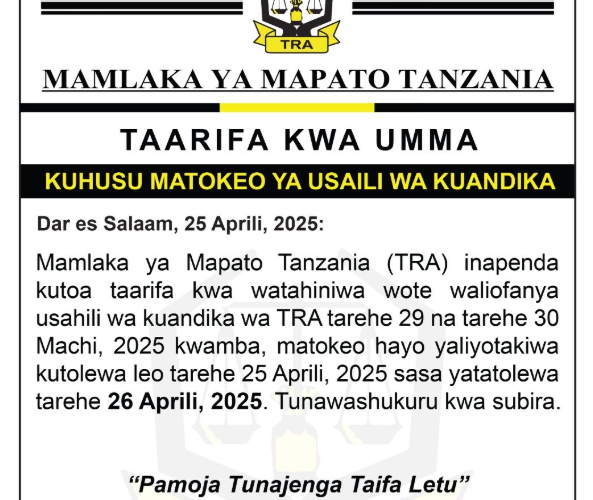 Matokeo ya Usaili wa Kuandika TRA 2025: Dar es Salaam, Aprili 25, 2025 – Mamlaka ...