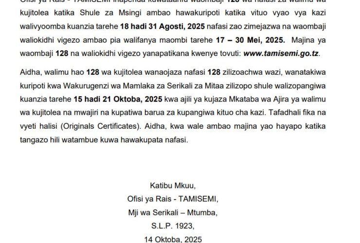 TAMISEMI Yatangaza Walimu 128 Waliochaguliwa Nafasi za Kujitolea 2025: TAMISEMI Yatangaza Orodha ya Walimu wa ...