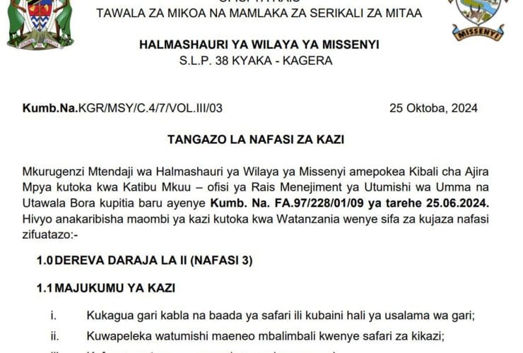 Nafasi 3 za Kazi ya Dereva Halmashauri ya Wilaya ya Missenyi Mkurugenzi Mtendaji wa Halmashauri ...